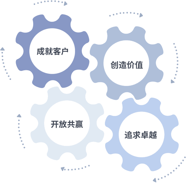 成就客户是一切决策的出发点,,,创造价值是衡量所有工作的标准,,追求卓越是我们做事做人的态度,,,开放共赢是我们的格局也是最终的结果。。。价值观的齿轮环环相扣,,,,推动着组织里的每个人不断向前。。