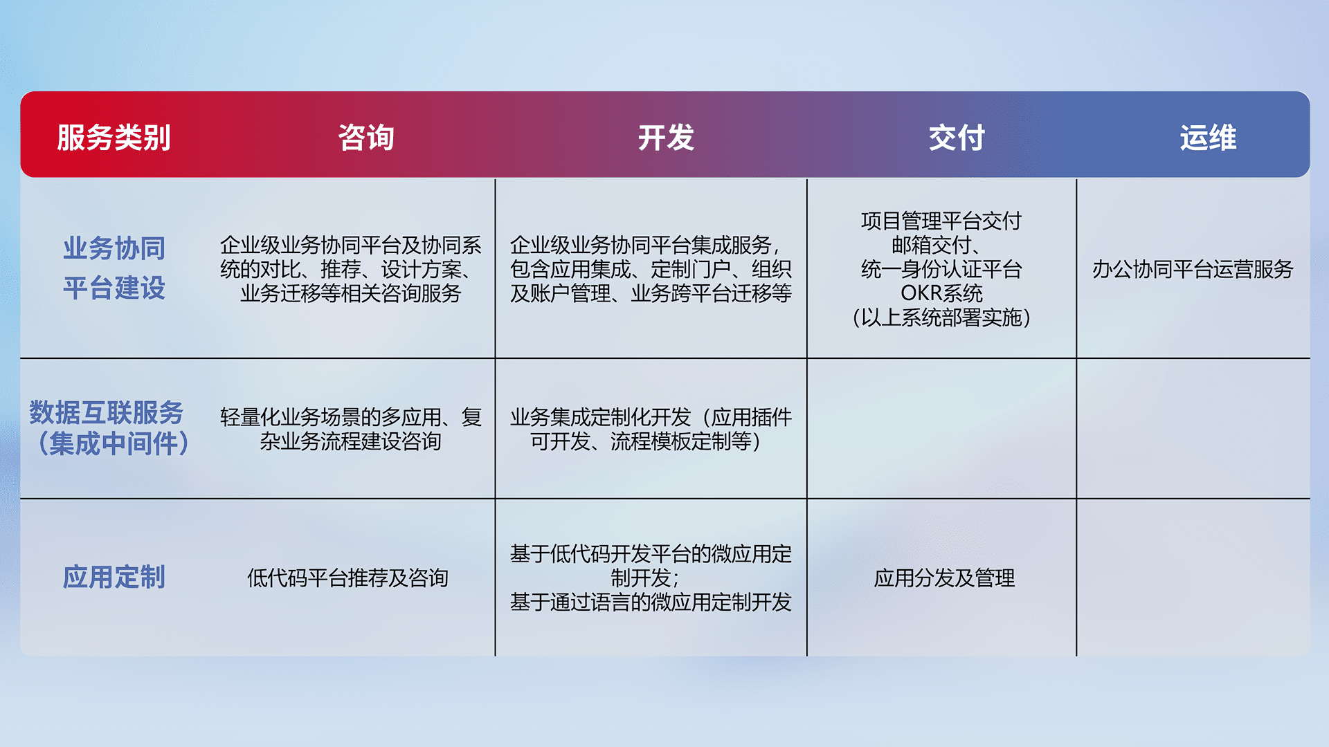 针对钉钉、、企微、、、、IDaas等平台级产品提供产品的规划、、方案、、、、交付、、、定制化开发等服务,,,实现如统一协同办公、、、、智能客户服务、、、、混合会议管理、、、智能数据查询、、、、等业务场景,,,,实现数字化转型。。。。